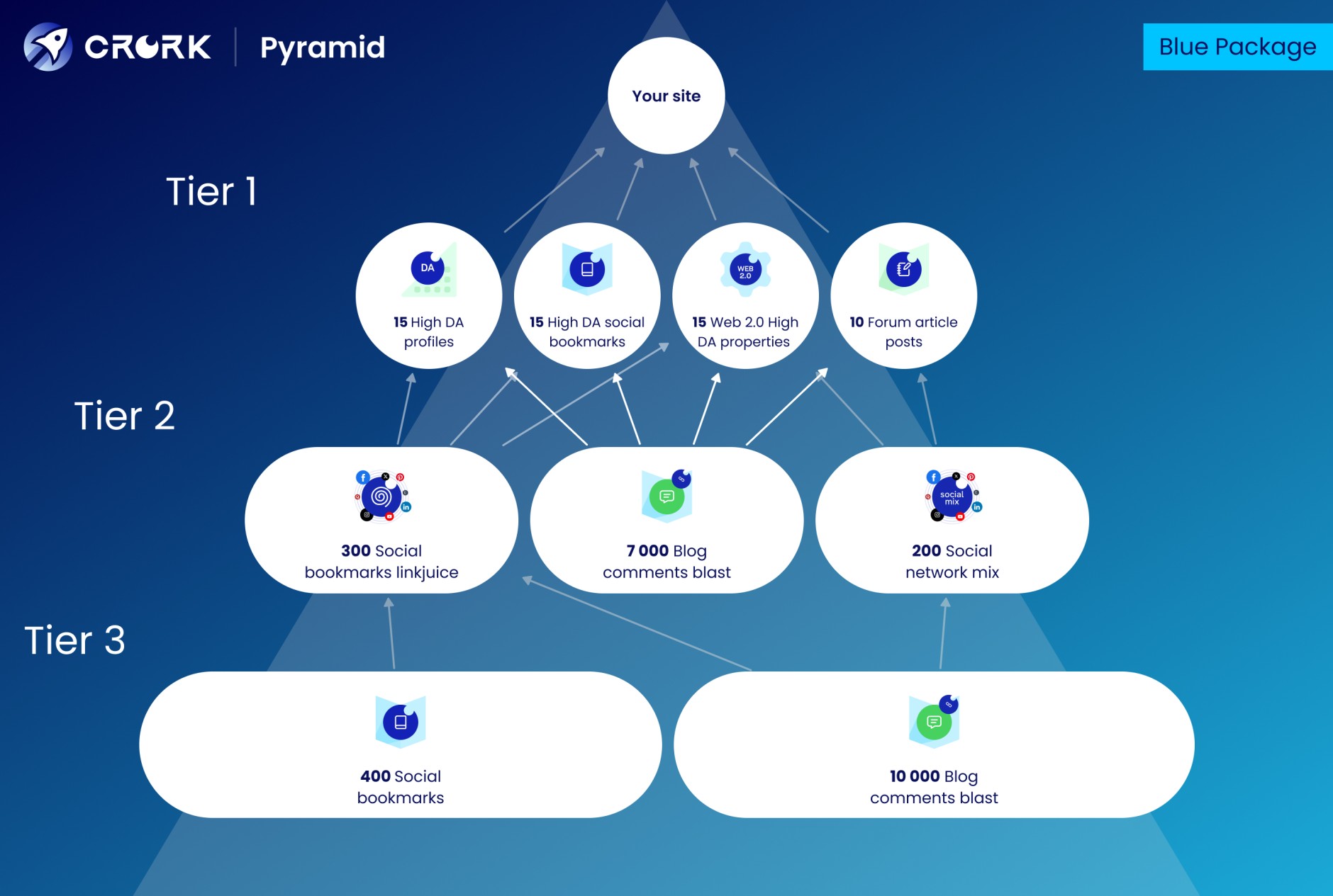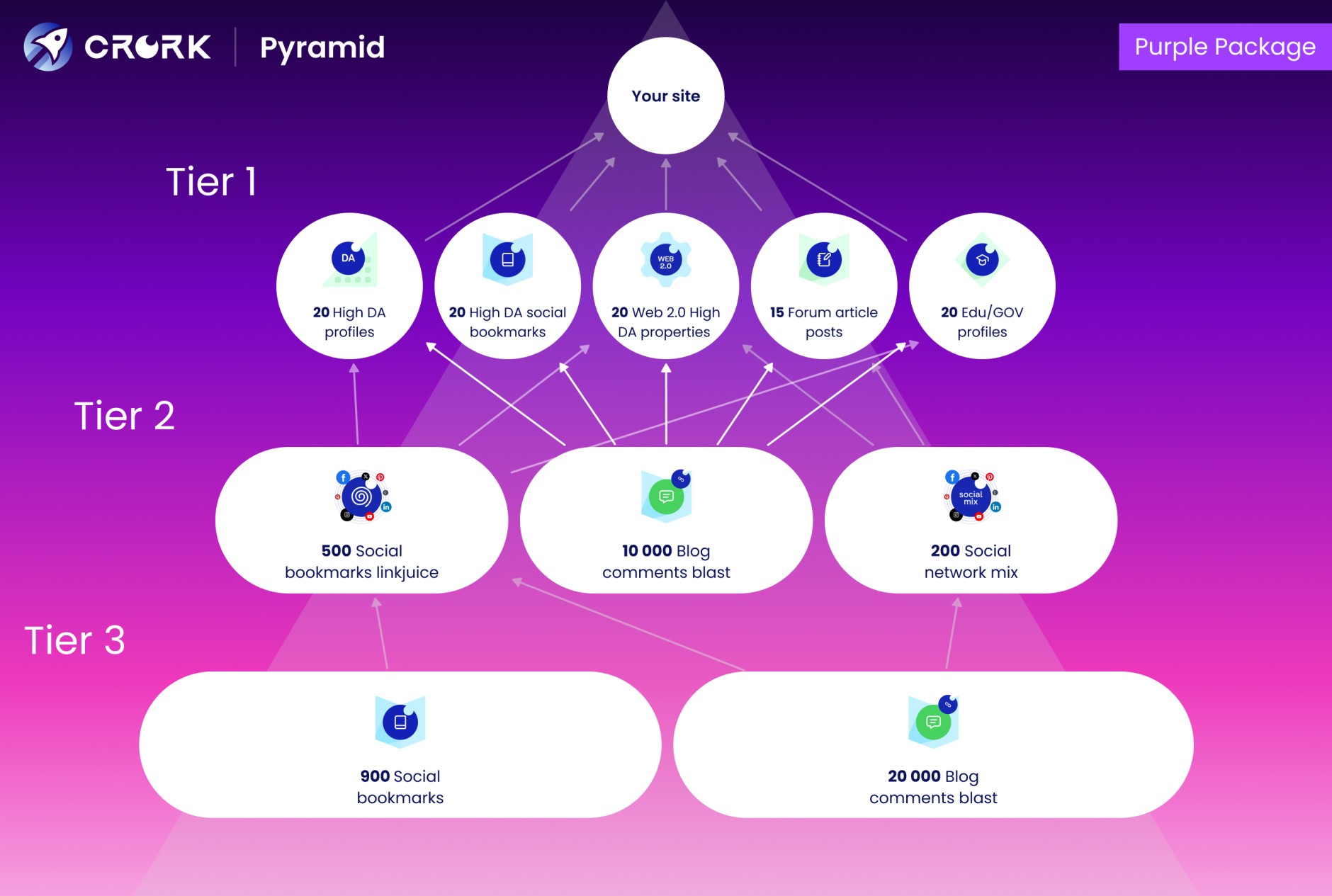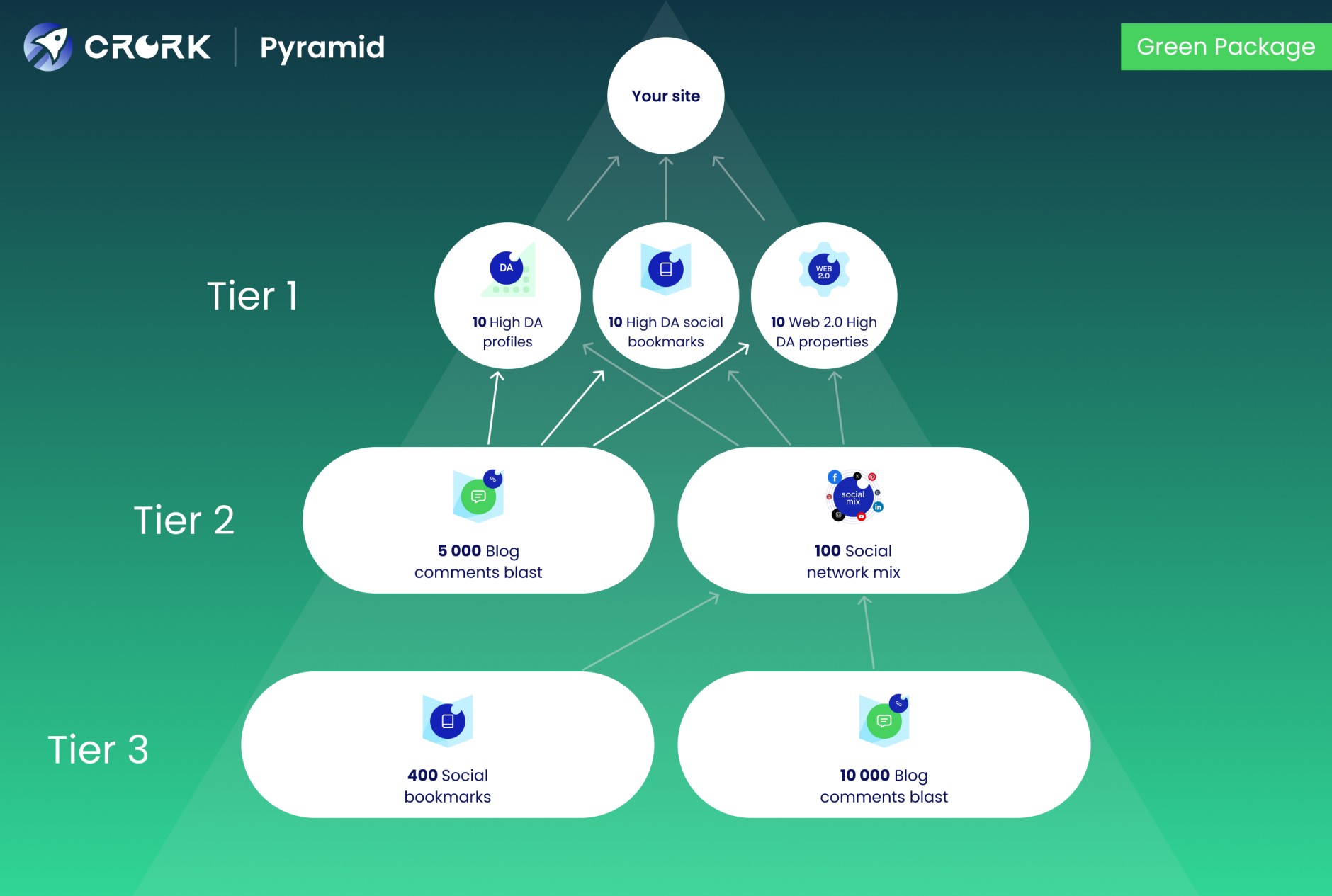 This pyramid allows you to send high authority Iinks to your money site, strengthens the site itself and Iinks from all layers and improves the index rate of all backlinks. Greater results and more traffic!